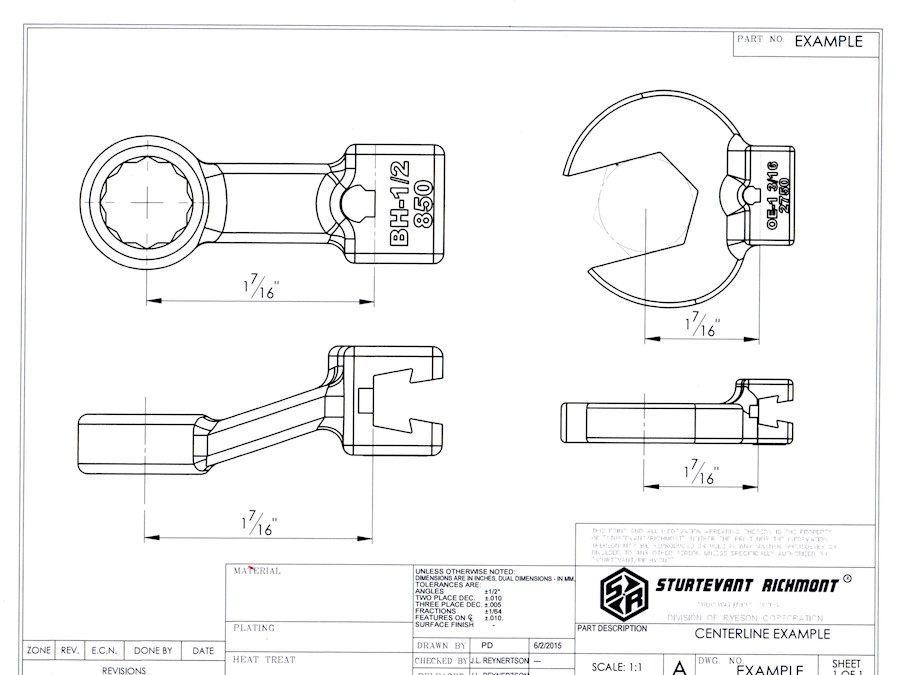 Sturtevant Richmont wrenches all come with two common centerlines. Heads 1 1/4" and less have 1 7⁄16” (36.5 mm) common centerline and heads 1 5/16" and more have 3 7⁄8” (98.4mm) common centerline. This means you can change between heads with the same common centerline and not change the torque output.